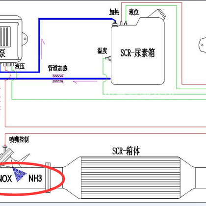 SCR系統(tǒng)用于降低尾氣中氮氧化物,依據(jù)發(fā)動(dòng)機(jī)工況、排氣溫度及設(shè)定的NOx轉(zhuǎn)化效率,經(jīng)計(jì)算將適量的氨水溶液噴射至排氣管中與NOx發(fā)生反應(yīng)。在排氣管的混合區(qū),氨水溶液遇到高溫分解成NH3和H2O,與排氣充分混合后進(jìn)入SCR反應(yīng)裝置。在催化反應(yīng)區(qū),NH3和NOx反應(yīng)生成N2和H2O,排到大氣中。